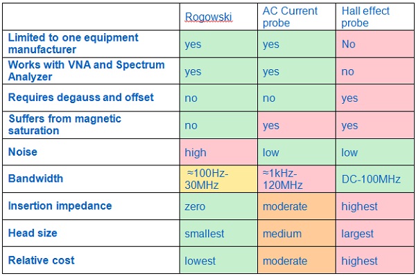 上圖中的羅氏線圈、交流探頭能配套任何廠家的測試設(shè)備使用,例如:示波器、矢量網(wǎng)絡(luò)分析儀、頻譜儀等;而霍爾傳感器必須要和指定型號的儀器、設(shè)備配套使用。羅氏線圈除了不能測試直流(DC)以外,在幾乎所有的性能上都要優(yōu)于交流探頭,因此羅氏線圈也經(jīng)常被用于高精度的小阻抗測試。